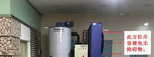 2、制冰機周圍無雜物堆放,制冰機散熱風扇與墻面至少保持1米的距離,如條件允許散熱風扇的方向保證無障礙物。